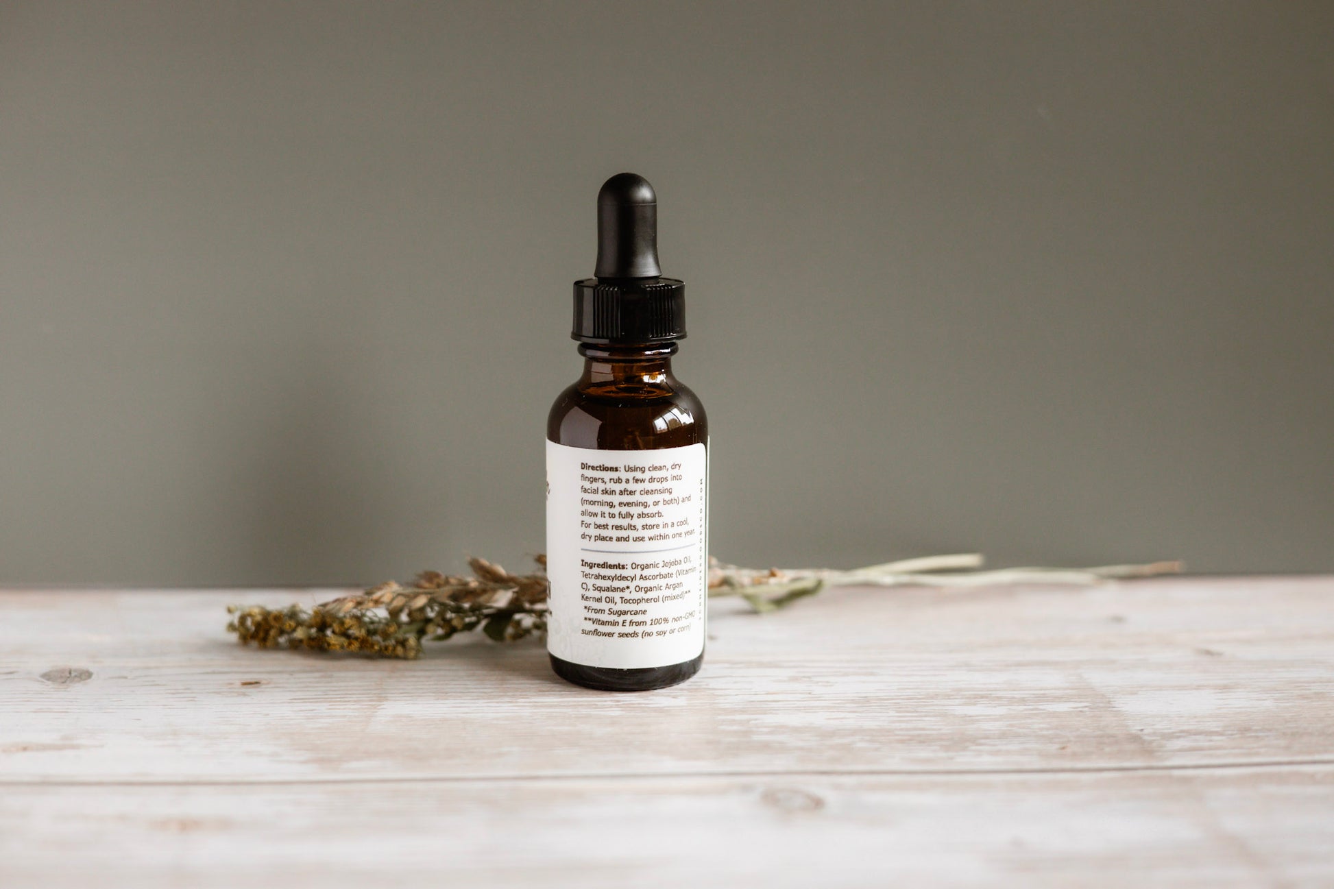 Ingredients: Organic Jojoba Oil, Tetrahexyldecyl Ascorbate (Vitamin C), Squalane, Organic Argan Oil, Vitamin E Oil